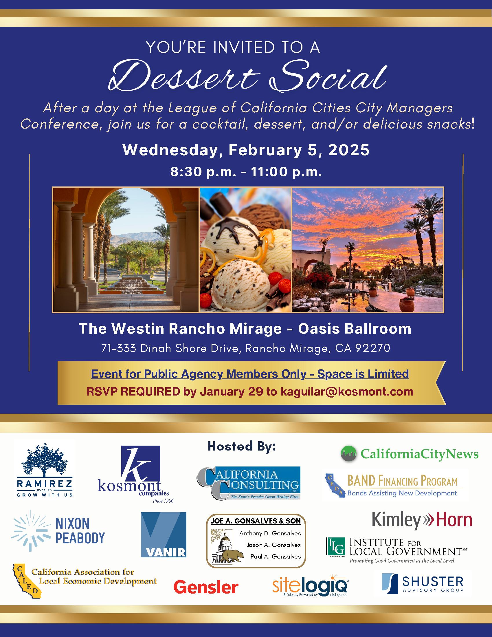 California City News is proud to co-host a dessert social with California Consulting, Kosmont Companies, and others during Cal Cities’ City Managers Conference. Join us February 5th at 8:30 PM in the Oasis Ballroom at the Westin Rancho Mirage.