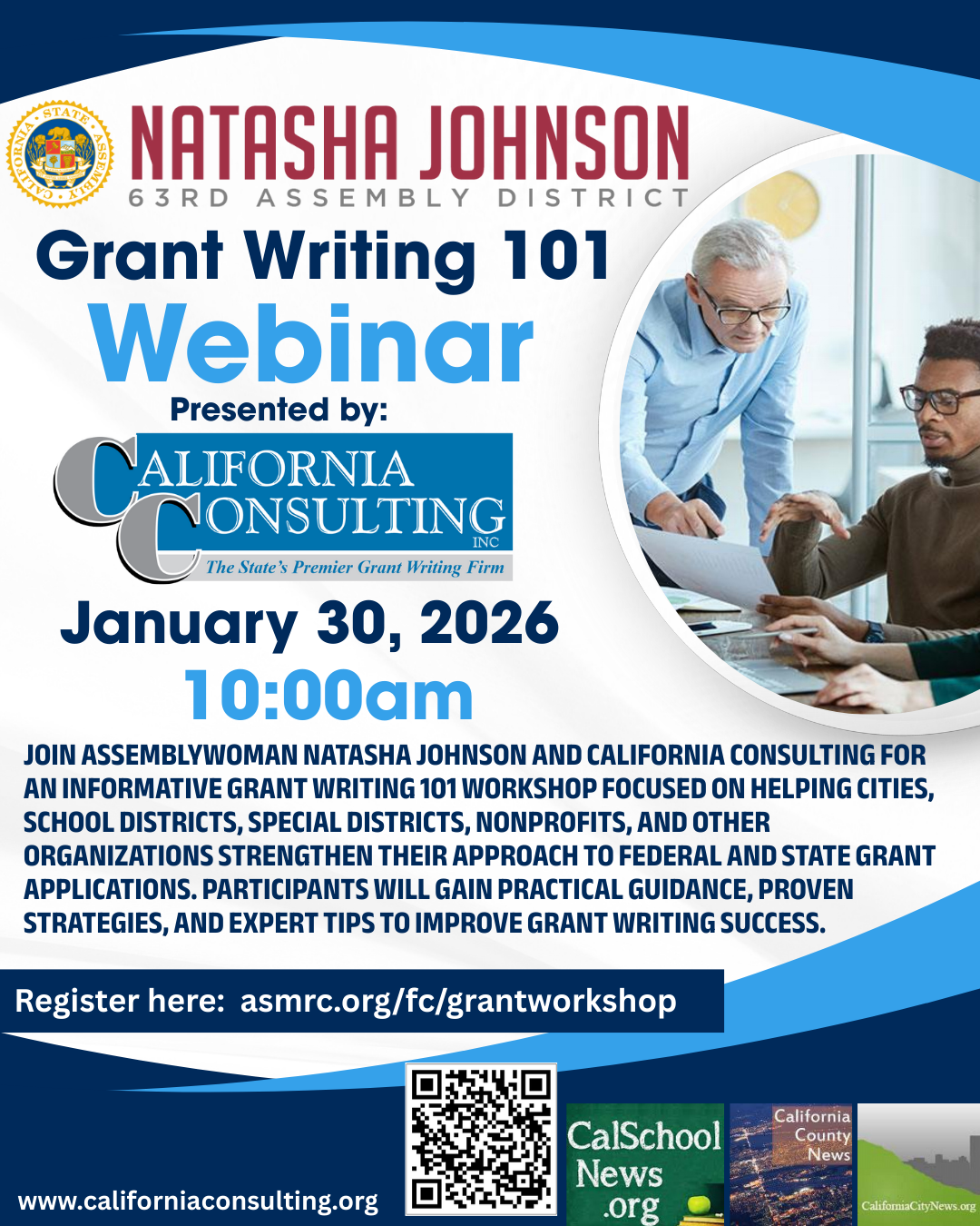 California Consulting and California City News are excited to announce the upcoming Grant Writing 101 Webinar with Assemblymember Natasha Johnson. This workshop is designed to provide cities, school districts, non-profits, and other organizations with expert insights and best-practices. Attendees will gain practical guidance and learn proven strategies to improve grant writing success.